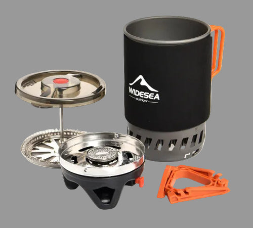 This portable, ultra-light, dual-use outdoor cooking system is designed for 1-2 people. Featuring windproof construction and efficient heat gathering, it’s ideal for camping, hiking, and outdoor adventures. Made of durable aluminum alloy, it includes a black coffee cup set.